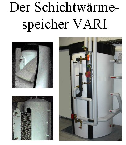 Als Pufferspeicher mit integrierter Brauchwassererwärmung kombiniert er die Funktion des reinen Wärmespeichers mit der des Brauchwasserspeichers. Ein zusätzlicher Trinkwasserspeicher (z.B. bei einer späteren Installation einer Solaranalage) ist nicht mehr erforderlich. Der VARI kann in jedem Heizungssystem eingesetzt werden und läßt sich individuell an Ihren Bedarf anpassen. Er stellt das Herz der häuslichen Wärmeversorgung dar.